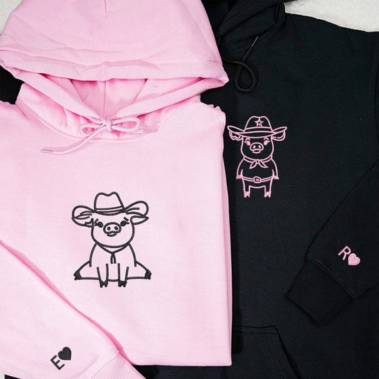 Cowboy Pigs Matching Hoodies for Couples - Custom Embroidered Sweatshirts
